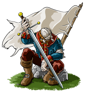 Klingt jetzt natürlich doof. Da beschwert er sich, daß er keine Ideen hat und dann kann er doch was zeichnen. Na ja, das was ich da aufs digitale Papier gekritzelt hab, das waren letztlich nur Linien, Kreise und Fingerübungen. Hauptsache ich hab die Angst vorm leeren Blatt überwunden und mit der Zeit schälten sich dann die ersten Ideen heraus und erste Tests begannen und wurden wieder verworfen. Und schließlich blinzelte mich zwischen all den Linien eine kleine, verängstigte Idee heraus an. Etwas verschämt und schüchtern, sich nicht sicher, ob sie denn gut wäre, hob sie dann doch zögerlich die Hand und piepste mit brüchiger Stimme was von: „Müder Krieger.“