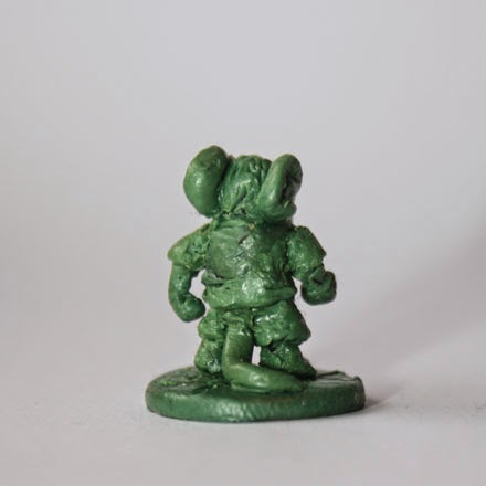 Nachdem ich alles fertig modelliert hatte, ließ ich die Figur erst einmal zwei Tage lang stehen, bis sie auch wirklich komplett durchgehärtet war. Danach zog ich sie aus dem Korken und knipste die überstehenden Drähte von den Füßen ab. Als Bodenplatte nahm ich mir einen Cent, den ich zuvor mit Greenstuff überzogen und leichte Rillen hineinmodelliert hatte und klebte meinen kleinen Kerl darauf. Danach sah er wie folgt aus. Der Kopf liegt leider zu tief und er wirkt etwas bulliger, aber ich möchte behaupten, dass er für meinen ersten Versuch gar nicht mal so schlecht geworden ist. 🙂
