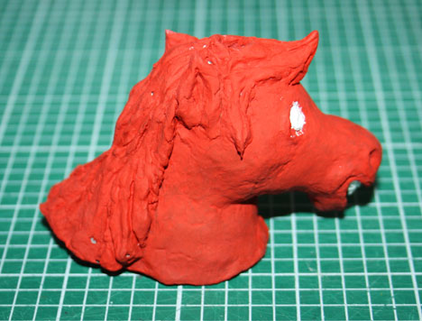 Nachdem das geschafft war ging’s an die Pampe. Ich ummantelte den Grundkörper mit Pappmaché und modellierte dann mit meinem Werkzeug die Details heraus. (Ich habe endlich mein 2 € Plastikmodellierwerkzeug wiedergefunden und brauchte mich dieses Mal nicht mit Schraubenzieher und Co. behelfen. Damit geht es doch besser. 😀 ) Dank der Vorarbeit war es dieses Mal deutlich leichter, als bei Blue. Was ich hier auch noch gemacht habe (wovon ich aber leider keine Bilder habe) ist, dass ich erst nur den reinen Kopf ohne Mähne, Ohren und Augen modelliert habe. Bei den Augen wurden lediglich die Augenhöhlen vorbereitet. Danach ließ ich alles trocknen und packte dann den Rest oben drauf. Dazu habe ich die Stellen, auf die ich neues Pappmaché auftragen würde, mit Wasser gut angefeuchtet. In wie weit so etwas nötig ist, weiß ich nicht. Geschadet hat es auf alle Fälle nicht. Die aufgesetzte Mähne hält. 🙂