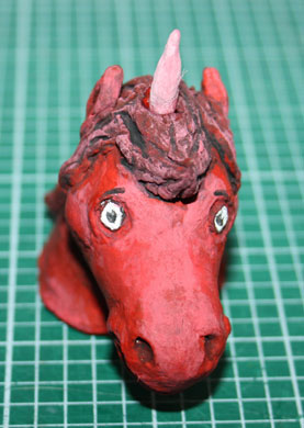 Nachdem ich vor einiger Zeit schon mal eine Blue-Büste gebastelt hatte, war es an der Zeit, auch Red in Pappmaché zu verewigen. Wer die beiden nicht kennt, der kann ja mal in mein Webcomic The Bess Effect reinlesen, dass Bess schreibt und ich zeichne. Dort kommen die beiden Einhornpegasi vor. 🙂