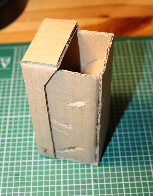 Ich hatte schließlich eine Idee und setzte diese erst einmal in klein um. Der kleine Kerl hier ist 10 cm groß und funktionierte schon mal recht gut, nur mit der Befestigung der Klappe war ich noch nicht ganz glücklich. Auch wollte ich oben den Turm komplett geschlossen haben. Aber die Richtung war klar.